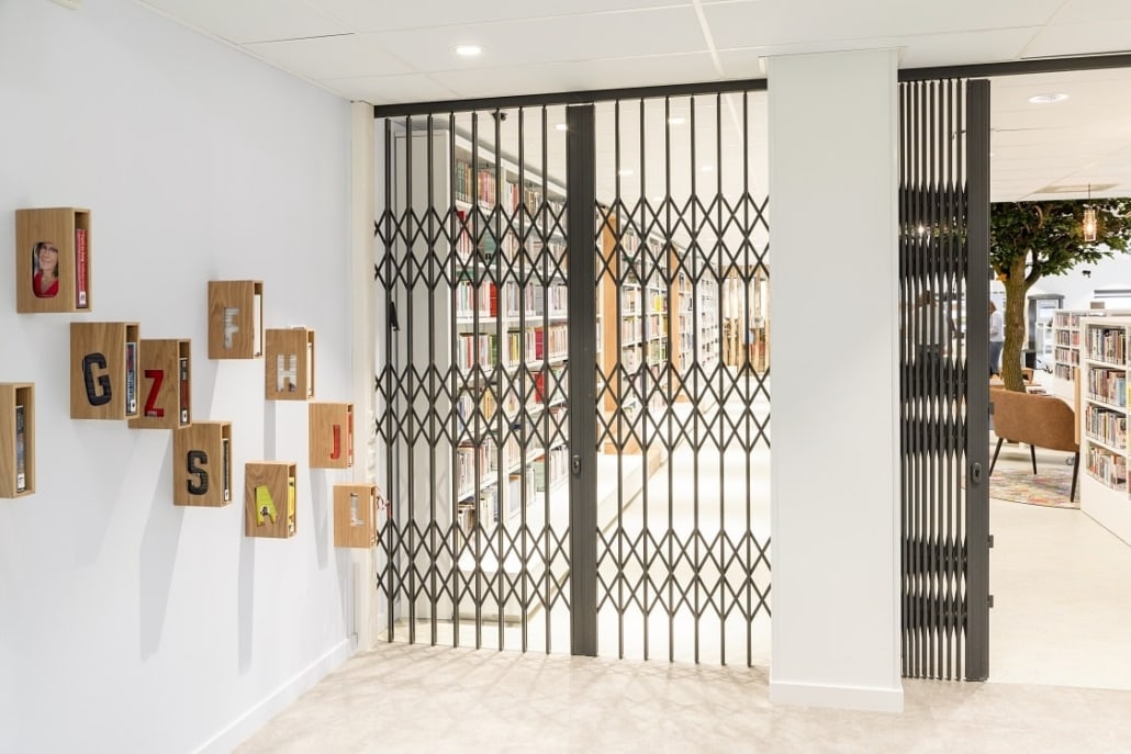Door het plaatsen van de nieuwe schaarhekken wordt de algemene ruimte afgesloten van de boekenkasten en computers. Hierdoor zijn de betreffende spullen extra beveiligd na sluitingstijd.